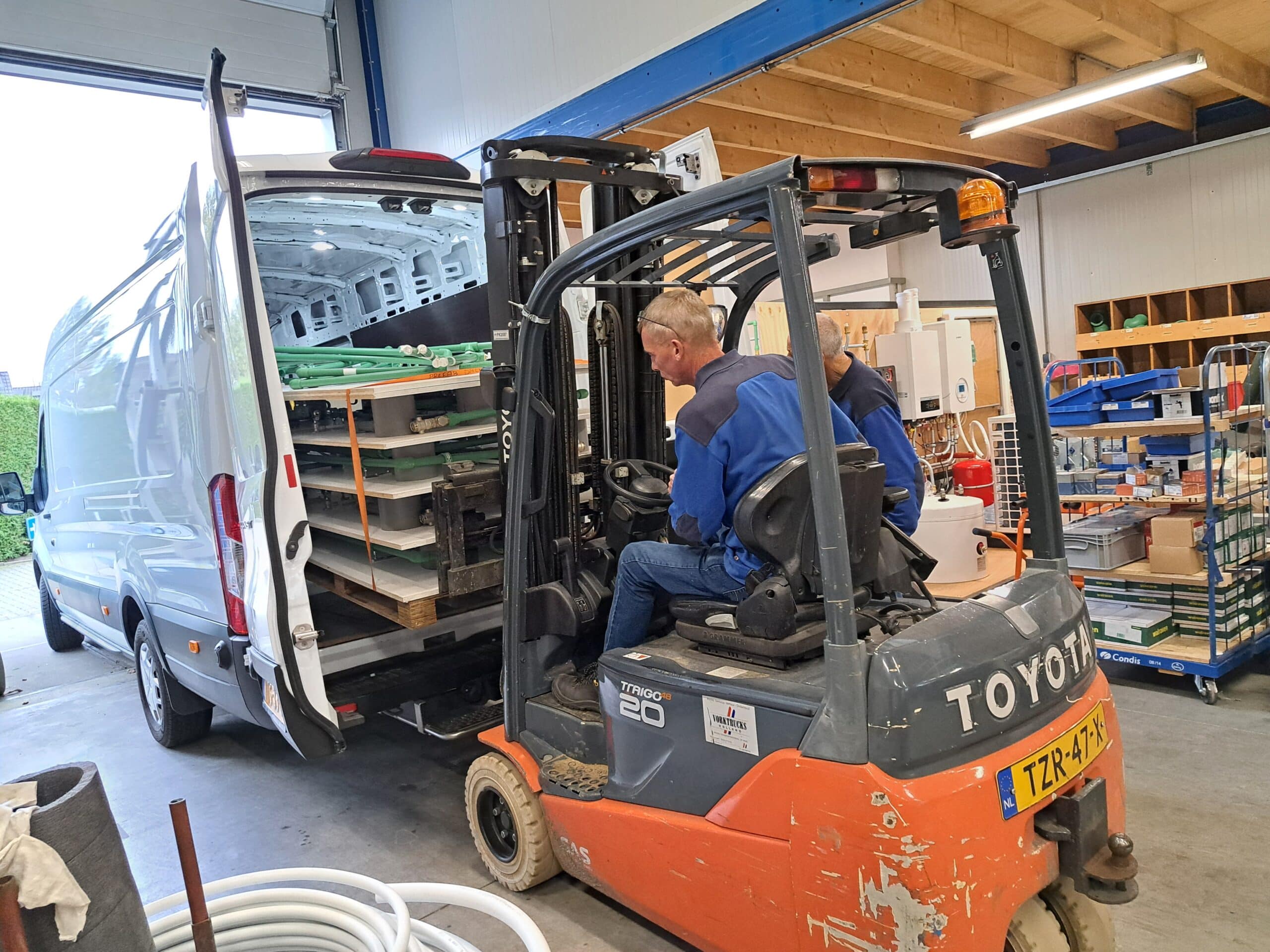 Ook logistiek dachten we mee. Monteurs moeten via steigers aan de achterkant de woningen betreden, waardoor grote materialen lastig te verplaatsen zijn. Onze oplossing? Speciale, smalle volumebakken gevuld met precies het juiste materiaal, die eenvoudig via de balkondeuren naar binnen kunnen. Dit bespaart tijd én onnodige loopbewegingen.